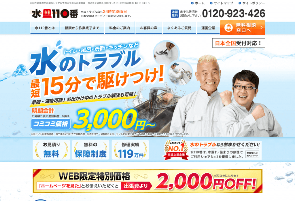 水110番は年間20万件以上の実績を持つ人気のトイレつまり修理業者です。