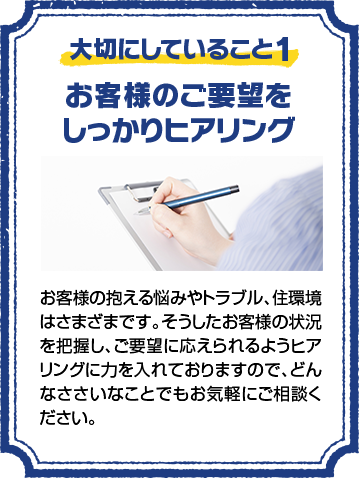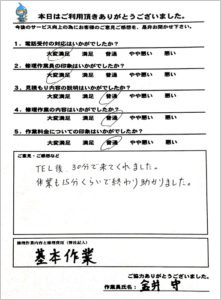 現場に到着後、お客様立合いでトラブルの状況を確認させていただきます。お見積り内容を、分かりやすく説明させて頂きお見積り料金にご了承を頂いた後、作業を開始させて頂きます。出張調査はここまで無料です。