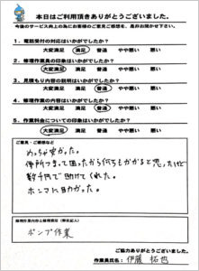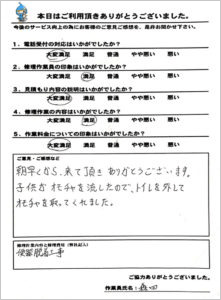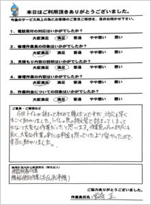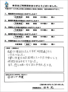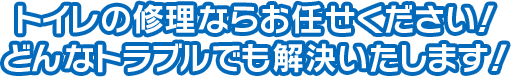 スタッフがご説明させて頂いた作業内容通りに修理作業を行います。もちろん、無断で追加作業は等は一切行いませんので、追加費用は一切かかりません。当社では、素早く安価にトイレトラブルの修理が行えるよう研修を徹底しているので安心です。